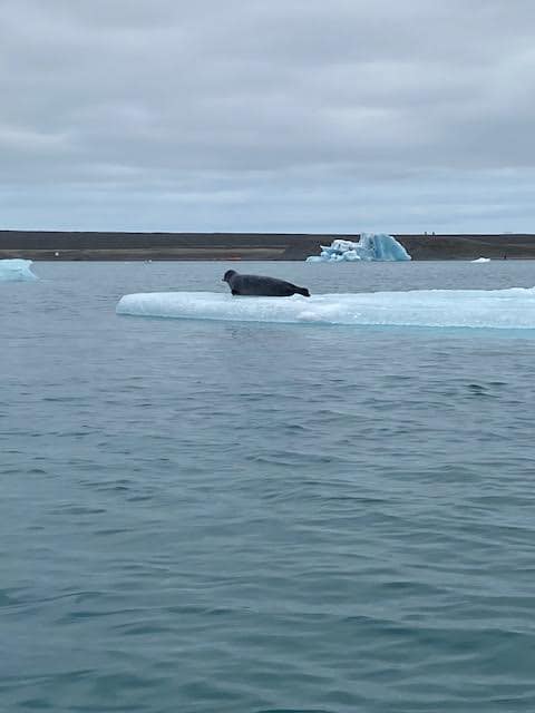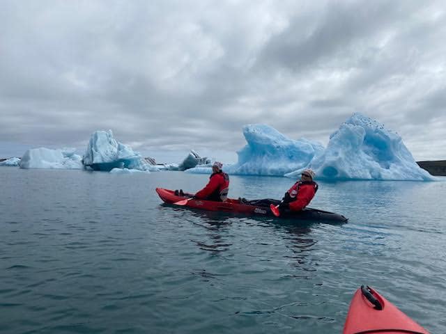 The kayaking is in a group of about 10 people, the outfitter provides protective clothing (rain top and rain pants that you wear over your own clothes, plus rubber boots), and then you go out on the lagoon in sit-on-top kayaks (mostly doubles but also some singles) for about an hour. Our guide grew up in the area near the lagoon and was really great, telling us about the glacier environment and how the icebergs move through the lagoon. There are tons of seals in the lagoon (we all agreed that whales would be even cooler!!) and we were lucky enough to see one lounging on a floating iceberg. This was truly a bucket list experience; highly recommended!