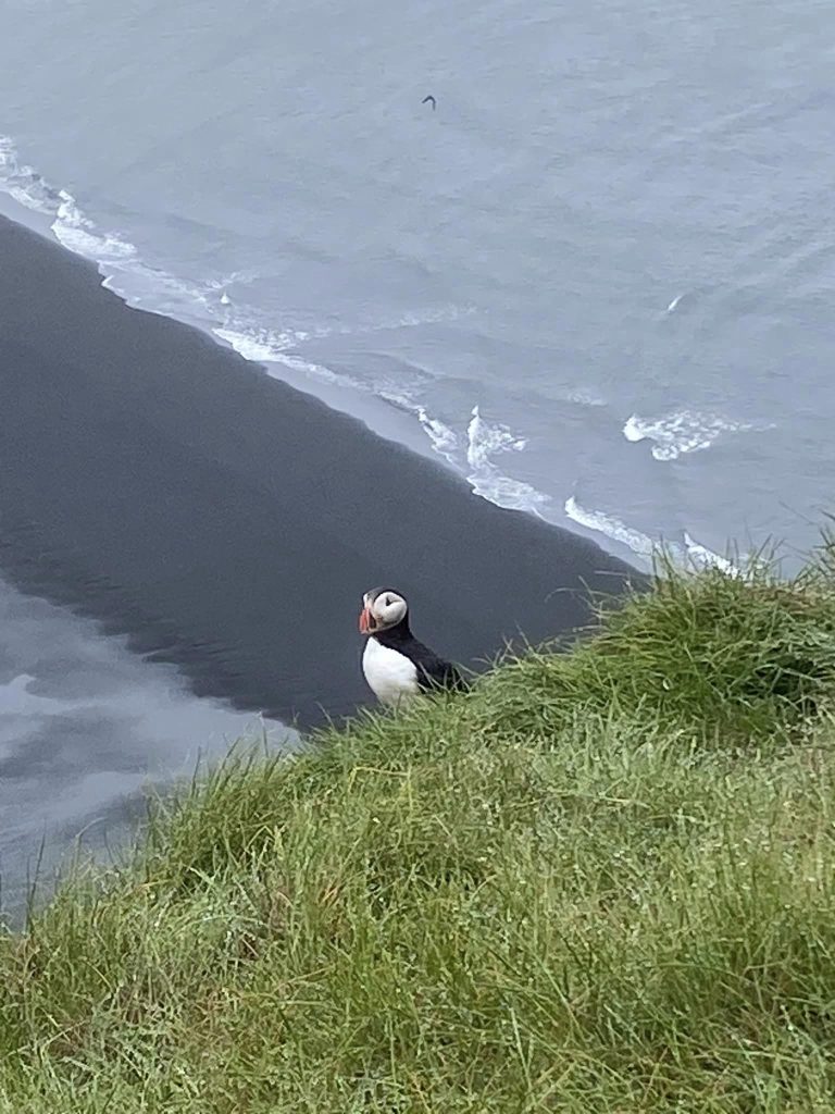 I’m not that much of a bird person and had no idea that puffins lived in Iceland, but it turns out that there are numerous puffin colonies on the southern coast. One of our original ideas for the trip had been to drive the entire ring road, but between the cost of gas (~US $10 a gallon) and the amount of driving versus doing fun stuff, we changed plans and decided to do a puffin tour. This very cool tour started with being pulled in a wagon behind a tractor across the volcanic tidal flats, to the headland where the first settlers of Iceland landed in 874. We then hiked out to three different puffin colonies (they’re totally unbothered by people and live in burrows up to five feet deep!), and also saw skua (huge brown predatory gulls), and a herd of free-ranging sheep. All of us really loved this tour! Afterward, we headed back to Vik, where we took a dip in the hot tub at the public swimming pool and then camped at the in-town campground.