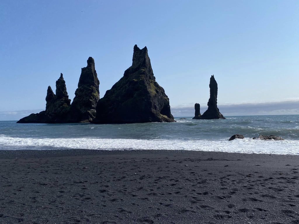On day two, we went to the Geysir geothermal area and the Gullfoss waterfall, both very impressive! As expected, there were more tour bus crowds here, but at Geysir we hiked to the upper observation area where you can watch the Strokkur geyser erupt (very cool!), and then we ate lunch in the Geysir restaurant which was very tasty. You get pretty wet on the observation decks at Gullfoss, so we then warmed up at the Secret Lagoon hot springs, which are smaller but more rustic than the Blue Lagoon. There’s a nice changing room with lockers, and the pool itself is very peaceful and beautiful. We then drove down to the coast village of Vik (vik=bay; Reykjavik=smoky bay) where we got a campsite at Vik Campsite. The campground is right near the center of town, and (as with most campgrounds we stayed in) was around US $40 for three people and an electric hookup. Vik is a cute town right on the water, with a nice cafe and restaurant in the shopping plaza with the supermarket.