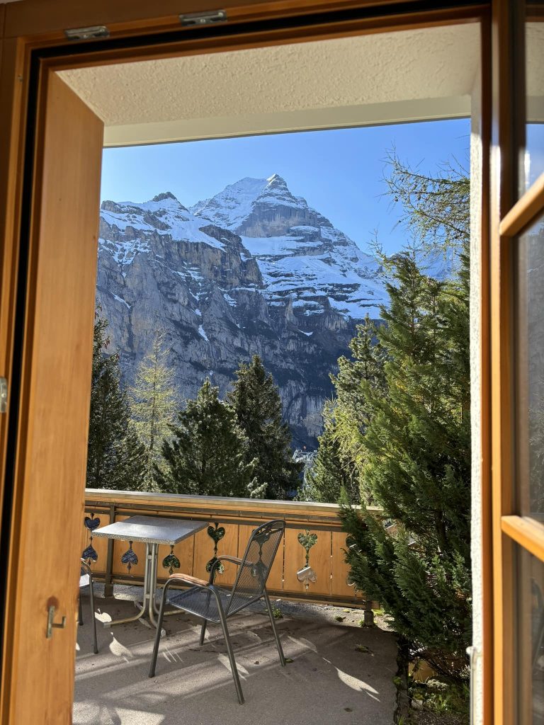 Mürren is accessible only by public transport, unless you live there. We took a regular train from Bern to Interlaken, then Interlaken to Lauterbrunnen, where we switched to a cable car, then a cog train to get to Mürren. This was already cool, and Mürren itself was so incredibly beautiful and peaceful. We stayed at the Hotel Alpenruh, which is at the very end of the main pedestrian street. We really liked this hotel (great breakfast buffet!) and would definitely stay there again. Our room had a private terrace with a mind-blowing view of the mountains, and the weather was incredible. Totally clear, not hot, and not cold. I had brought tons of rain gear and warm clothes from home, and they never even came out of my suitcase.
